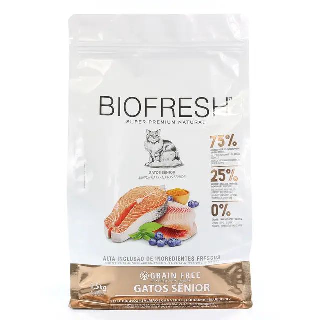 Alimento seco completo y balanceado Super Premium Natural Grain Free para gatos adultos senior de la marca Biofresh, sabor Pescado Blanco, Salmón, Té Verde, Cúrcuma y Arándano. Sin aromatizantes, colorantes ni conservantes artificiales, con conservación 100% natural con antioxidantes naturales como el extracto de romero y la vitamina E. Articulaciones protegidas gracias a la condroitina. Longevidad saludable, palatabilidad reforzada y salud renal y cardiaca. Inclusión de ingredientes naturales frescos y funcionales de altísimo estándar como carnes, frutas y verduras con niveles nutricionales elevados y una excelente absorción por el organismo. Tracto urinario saludable con equilibrio de minerales y control de ph; heces firmes y con olor reducido gracias a su proteína de alta absorción + extracto de yuca. Gracias a que es un alimento hecho con un 75% de ingredientes de origen animal seleccionados, con proteínas de muy alta calidad y muy fáciles de digerir, la ausencia de granos y bajo porcentaje de carbohidratos, sumado a la adición de condroitina que ayuda a mantener las articulaciones saludables, este alimento balanceado ayudará a mantener la condición corporal ideal en tu gato senior.