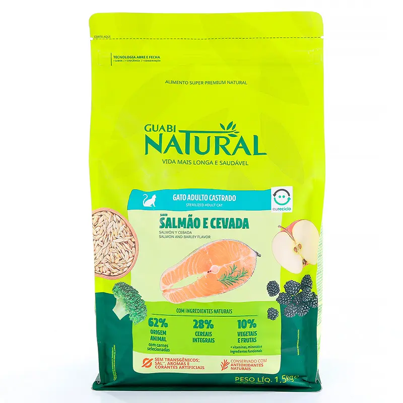Alimento seco completo y balanceado Super Premium Natural para gatos adultos castrados de la marca Guabi Natural, sabor Salmón y Cebada, con cereales integrales, vegetales y frutas. Sin aromatizantes, colorantes ni conservantes artificiales, conservación 100% natural con antioxidantes naturales como el extracto de romero y el concentrado de tocoferoles. Con una cantidad elevada de carnes seleccionadas de alta palatabilidad y enriquecidas con fuentes ricas en omega 6/3, que contribuyen para una piel y pelaje más saludables, la inclusión de vegetales y frutas seleccionados y enriquecidos con antioxidantes que contribuyen a una vida más saludable y cereales integrales, ingredientes funcionales, fibras y prebióticos que ayudan a la salud intestinal y a la formación adecuada de heces. Tiene un nivel de proteínas ideal ya que es un alimento hecho con un 62% de ingredientes de origen animal seleccionados. Su formulación baja en calorías y carbohidratos, permite a los gatos castrados mantener un peso adecuado.