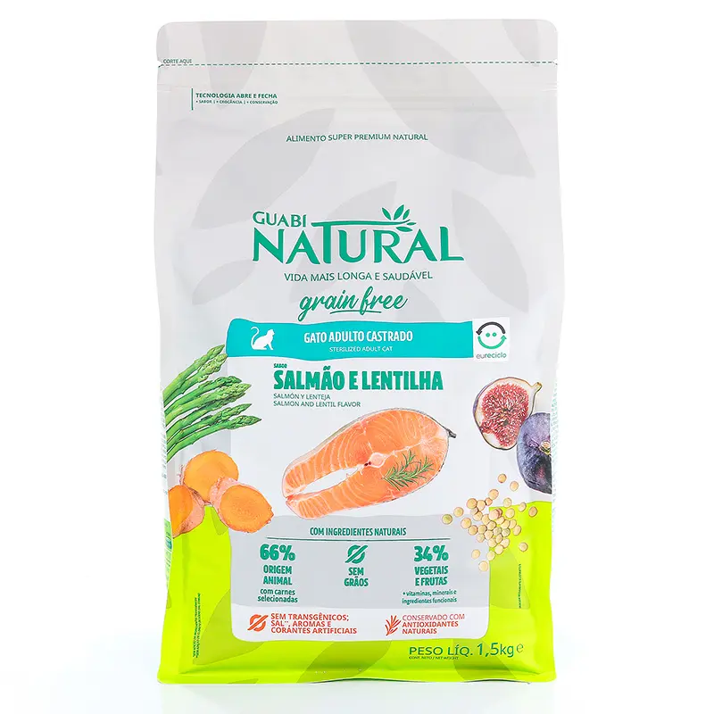 Alimento seco completo y balanceado Super Premium Natural para gatos adultos castrados GRAIN FREE de la marca Guabi Natural, sabor Salmón y Lentejas, con vegetales y frutas. Sin aromatizantes, colorantes ni conservantes artificiales, conservación 100% natural con antioxidantes naturales como el extracto de romero y el concentrado de tocoferoles. Con una cantidad elevada de carnes seleccionadas de alta palatabilidad y enriquecidas con fuentes ricas en omega 6/3, que contribuyen para una piel y pelaje más saludables, la inclusión de vegetales y frutas seleccionados y enriquecidos con antioxidantes que contribuyen a una vida más saludable e ingredientes funcionales, fibras y prebióticos que ayudan a la salud intestinal y a la formación adecuada de heces. Tiene un nivel de proteínas ideal ya que es un alimento hecho con un 66% de ingredientes de origen animal seleccionados y un 34% de vegetales y frutas. Su formulación baja en calorías y carbohidratos y libre de granos, permite a los gatos castrados mantener un peso adecuado.